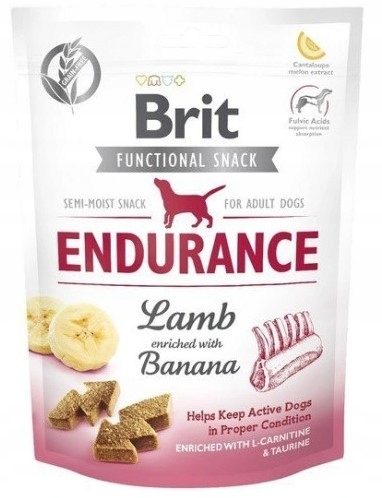 Brit Care Functional Snack Endurance to smakowity funkcjonalny przysmak w postaci miękkich kąsków, który wspaniale nadaje się jako nagroda podczas wspólnych spacerów czy treningów. Przysmak oparty został na jagnięcinie wraz dodatkiem bananów, które stanowią doskonałe źródło białka, witamin i minerałów. Dzięki swojej wysokiej smakowitości przysmak zadowoli nawet największych psich smakoszy. Zawartość kwasów fulwowych wspiera przyswajanie substancji odżywczych zawartych w przysmakach. Ekstrakt z melona Kantalupa korzystnie wpływa na stan skóry i sierści pupila.