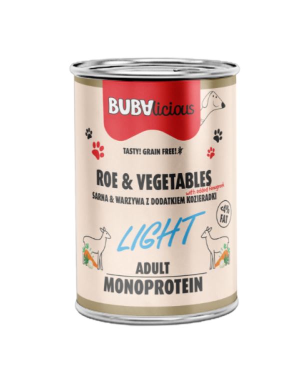 Karma mokra BUBAlicious Light to połączenie sarny (68,8% w tym 58,8% mięso mięśniowe, 10% bulion) i warzyw (10% marchewka 10% pietruszka, 10% seler) z dodatkiem kozieradki (0,2%) i minerałów (1%), które tworzą doskonałą kompozycję smakową, zaspokajającą apetyt psa i wspierającą jego zdrowie.