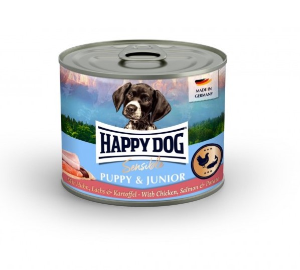 Mokra karma Happy Dog Sensible Puppy & Junior składa się ze smacznego kurczaka, świeżego łososia i lekkostrawnych ziemniaków. Przepis jest bezglutenowy i przygotowany bez dodatku cukru. Zawierająca ponad 90% białka zwierzęcego w białku całkowitym i zbilansowaną różnorodność białek, ta wysokiej jakości mokra karma jest odpowiednia dla psów od 8. tygodnia życia. Wyjątkowo smaczna karma w puszkach wspomaga harmonijny rozwój szczeniąt i młodych psów.