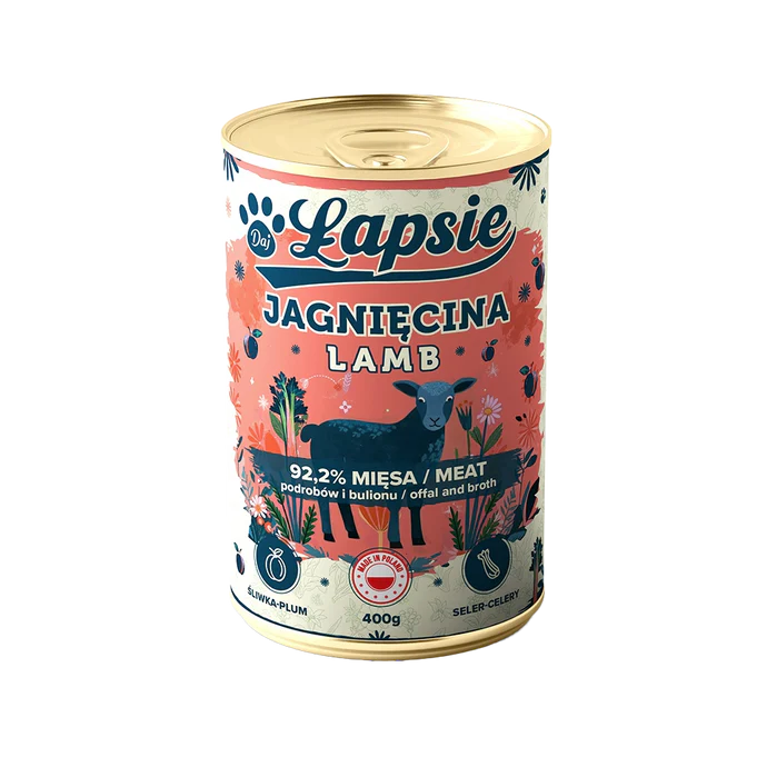 Każda puszka Łapsie to starannie skomponowany posiłek oparty na jednym źródle białka zwierzęcego (monobiałkowy skład), bogaty w naturalny bulion, aromatyczne zioła i soczyste owoce – takie jak gruszka, jabłko, morela czy śliwka.