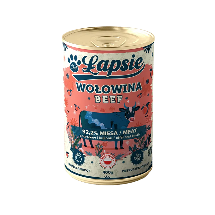 Każda puszka Łapsie to starannie skomponowany posiłek oparty na jednym źródle białka zwierzęcego (monobiałkowy skład), bogaty w naturalny bulion, aromatyczne zioła i soczyste owoce – takie jak gruszka, jabłko, morela czy śliwka.