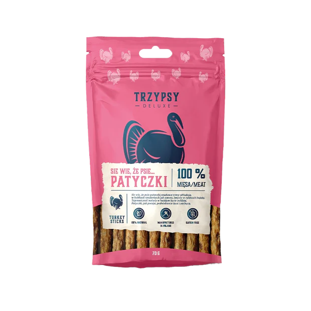 Sie Wie, że Psie… Pałki z indyka to w pełni naturalne, miękkie przysmaki dla psów, wykonane w 100% z mięsa, w formie pałeczek. Jeden patyk ma około 11,5 cm długości i jest bardzo łatwy do podzielenia. Nie zawierają konserwantów, barwników ani sztucznych wypełniaczy. Przysmak jest niezwykle aromatyczny i pożywny, stanowi doskonałe uzupełnienie codziennej diety każdego pupila. Idealnie sprawdzają się jako nagroda.