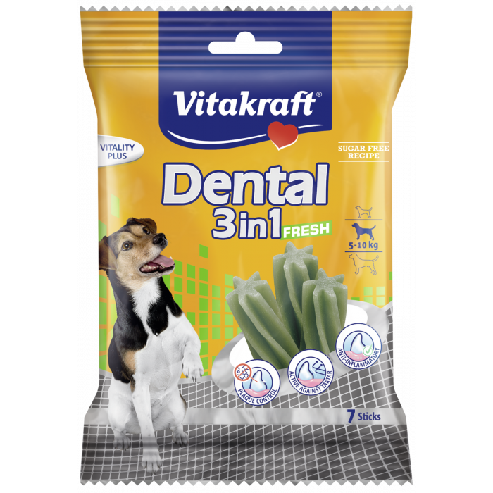 Dental 3w1 Fresh – dla nieodparcie świeżego oddechu psa! Pyszne sztyfty do pielęgnacji zębów z olejkiem miętowym aktywnie wspierają zdrowie zębów dzięki innowacyjnej kombinacji składników aktywnych 3w1 : Stay Clean™ ogranicza rozwój bakterii odpowiedzialnych za powstawanie płytki nazębnej, pirofosforany wiążą wapń zawarty w ślinie i spowalniają tworzenie kamienia nazębnego. Ponadto składnik cynkowy zapobiega zapaleniom dziąseł i przyczynia się do gojenia się ran w jamie ustnej.