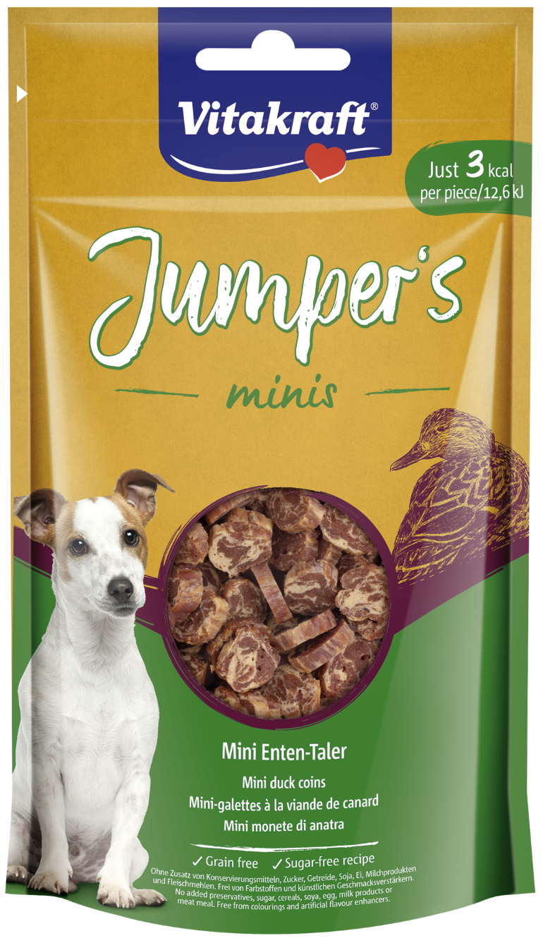Wyjątkowo małe talarki na mięso z kaczki są idealne jako smaczna nagroda między posiłkami, a także są idealne na przykład dla mniejszych psów. Mini monety są również po prostu nieodparte jako motywująca przekąska podczas treningu . Zachwycają też kęs za kęsem pełnią smaku – przy zaledwie 3 kcal na sztukę. Do produkcji Jumper’s Minis nie używa się cukru, zbóż, soi, jajek, nabiału i mączki mięsnej, nie dodaje się barwników, sztucznych wzmacniaczy smaku ani konserwantów. Aby nic nie stało na przeszkodzie beztroskiej zabawie!