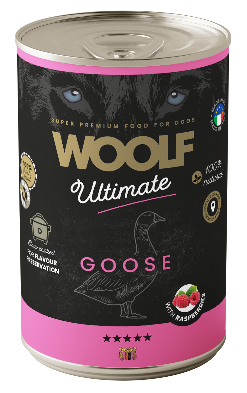 WOOLF ULTIMATE DOG CAN GOOSE & RASPBERRY 400g to wyjątkowy pokarm dla Twojego psa, stworzony z myślą o jego zdrowiu oraz wyjątkowym smaku. Nasza karma w puszce łączy w sobie starannie wyselekcjonowane składniki, które wspierają prawidłowy rozwój oraz ogólne samopoczucie psów w każdym wieku. Dzięki połączeniu mięsa gęsiego i soczystych malin, Twój pupil z pewnością pokocha tę wyjątkową kompozycję.